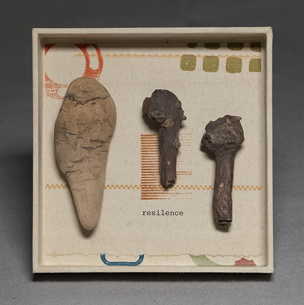 By communicating authentically and thoughtfully, my intention is that we (the book and I) will connect with viewers and create a mutual understanding, though both author and readers maintain distinct perceptions. For example, as I work on individual boxes for the ongoing project Archive of Now, I am interested in preserving and elevating natural objects. I contemplate these relics and then preserve them in custom-built reliquaries which are embellished with prints from mass-produced objects. I (type)write what I see in the object that is absent in the man-made. At each venue where the boxes were shown, a broad range of people have engaged meaningfully with the work, and through this inquiry and response, the installation as a whole is activated. Viewers often comment on the remarkable yet inexplicable fit of the text with the objects and are interested in my writing process.